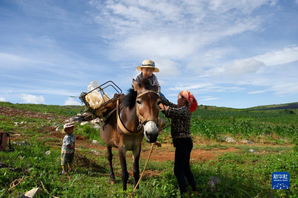 5月6日,在云南省丘北縣舍得鄉,一位母親在干農活前扶孩子下馬。