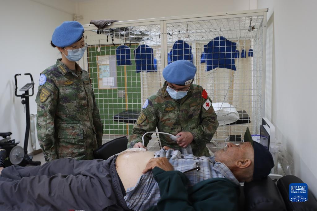 5月12日,在黎巴嫩阿爾庫卜關(guān)愛(ài)與發(fā)展中心,參加義診活動(dòng)的中國第21批赴黎巴嫩維和醫療分隊特診醫師喻智(后右)為病人做檢查。