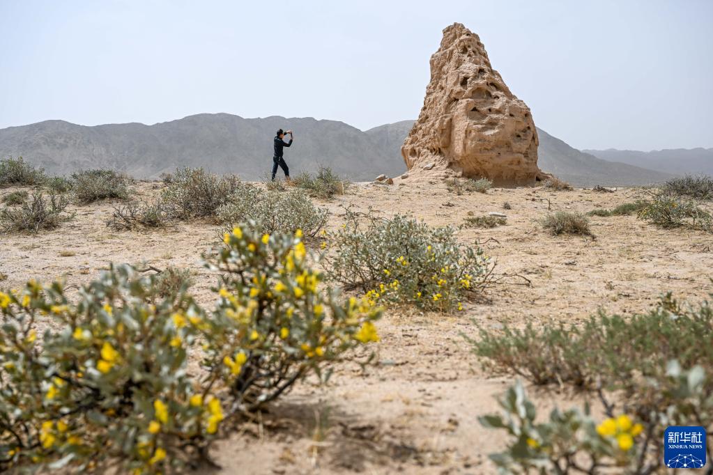 5月13日,駝峰(長(cháng)城)文物保護隊員布音烏力吉在阿拉善左旗一處烽火臺遺址巡查并拍照記錄。