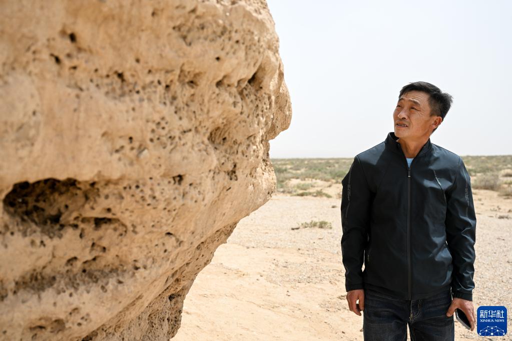 5月13日,駝峰(長(cháng)城)文物保護隊員布音烏力吉在觀(guān)察阿拉善左旗一處烽火臺遺址表面,查看是否有人為破壞痕跡。