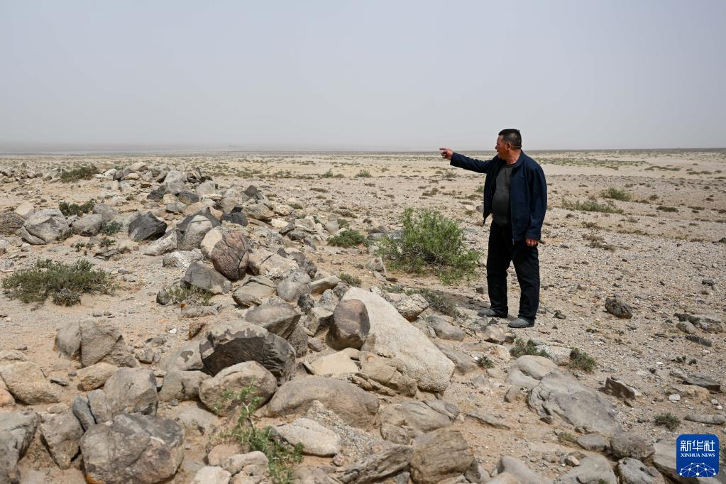 5月13日,駝峰(長(cháng)城)文物保護隊員許繼龍在巡查阿拉善左旗一處石圈遺址。
