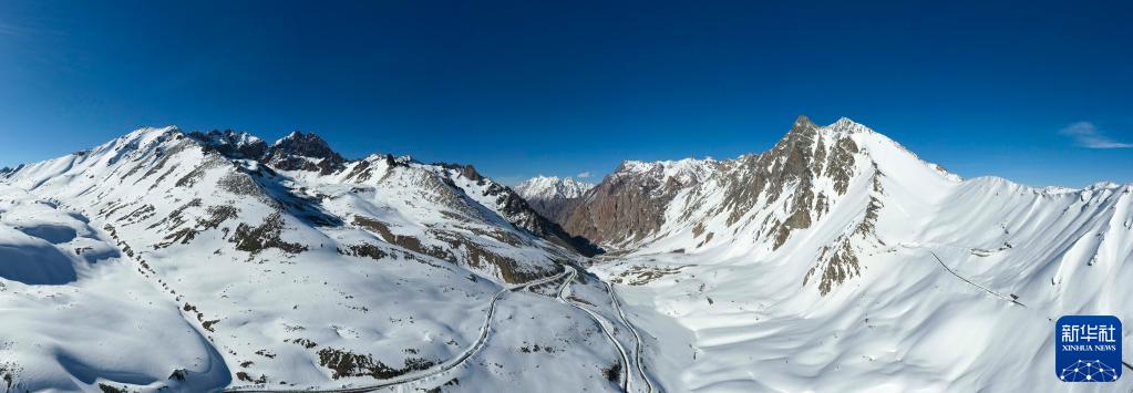新疆獨庫公路穿越雪山延綿的高海拔山區(5月10日攝,無(wú)人機全景照片)。