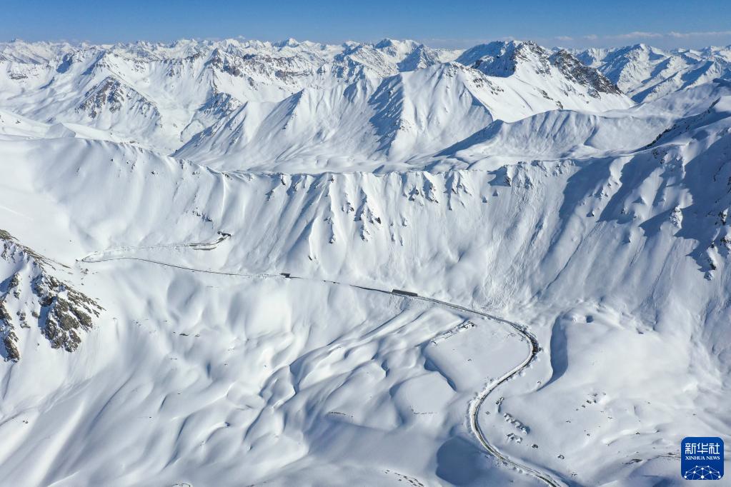 海拔約3400米的新疆獨庫公路哈希勒根隧道附近依舊是冰天雪地(5月10日攝,無(wú)人機照片)。