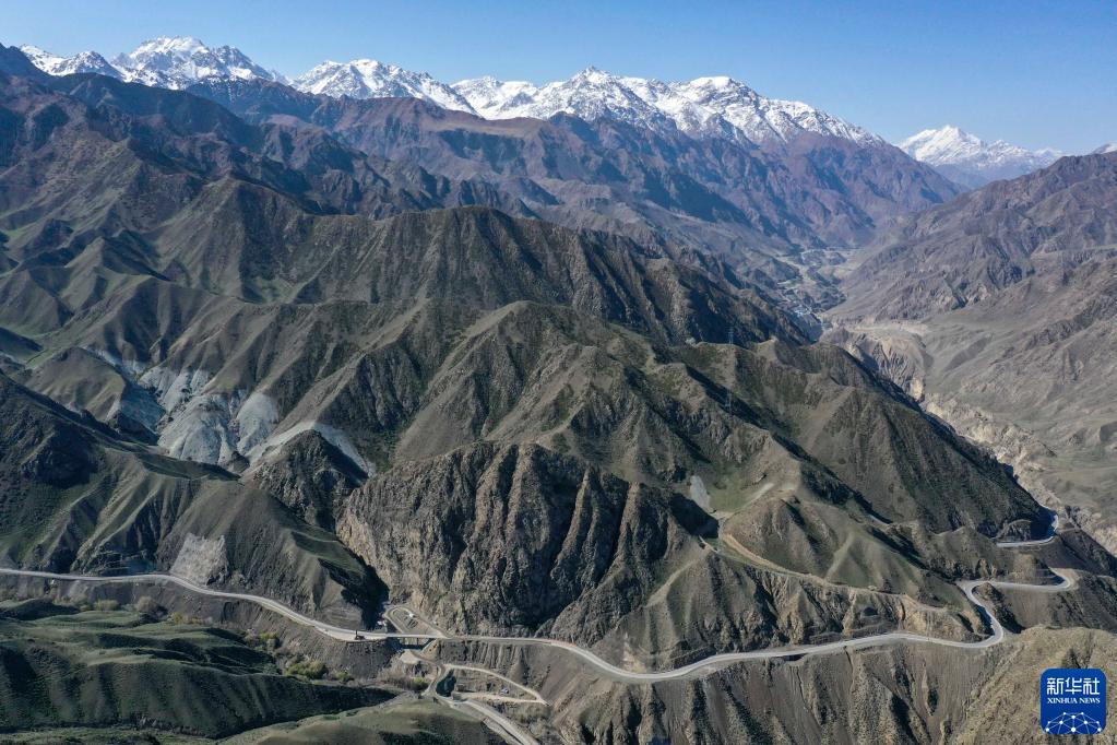 5月11日拍攝的新疆獨庫公路。海拔較低的山體積雪已消融,遠山更高海拔處依舊白雪皚皚(無(wú)人機照片)。