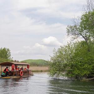 5月14日,游客乘船在黑龍江省牡丹江市的鏡泊湖世界地質(zhì)公園游玩。