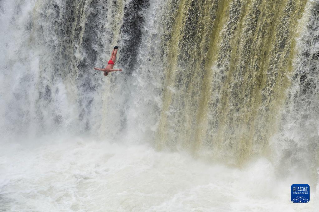 5月14日,在黑龍江省牡丹江市的鏡泊湖世界地質(zhì)公園,瀑布跳水表演者狄煥然從吊水樓瀑布上縱身躍下。