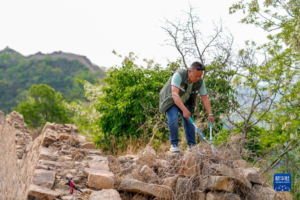 5月13日,趙春生在前后杖子段長(cháng)城上清理雜草。