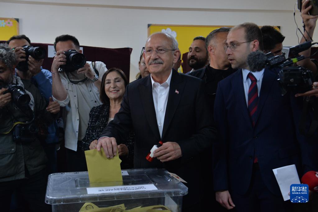 5月14日,在土耳其安卡拉,由6個(gè)反對黨組成的“民族聯(lián)盟”陣營(yíng)候選人凱末爾·克勒奇達爾奧盧(中)在一處投票站投票。