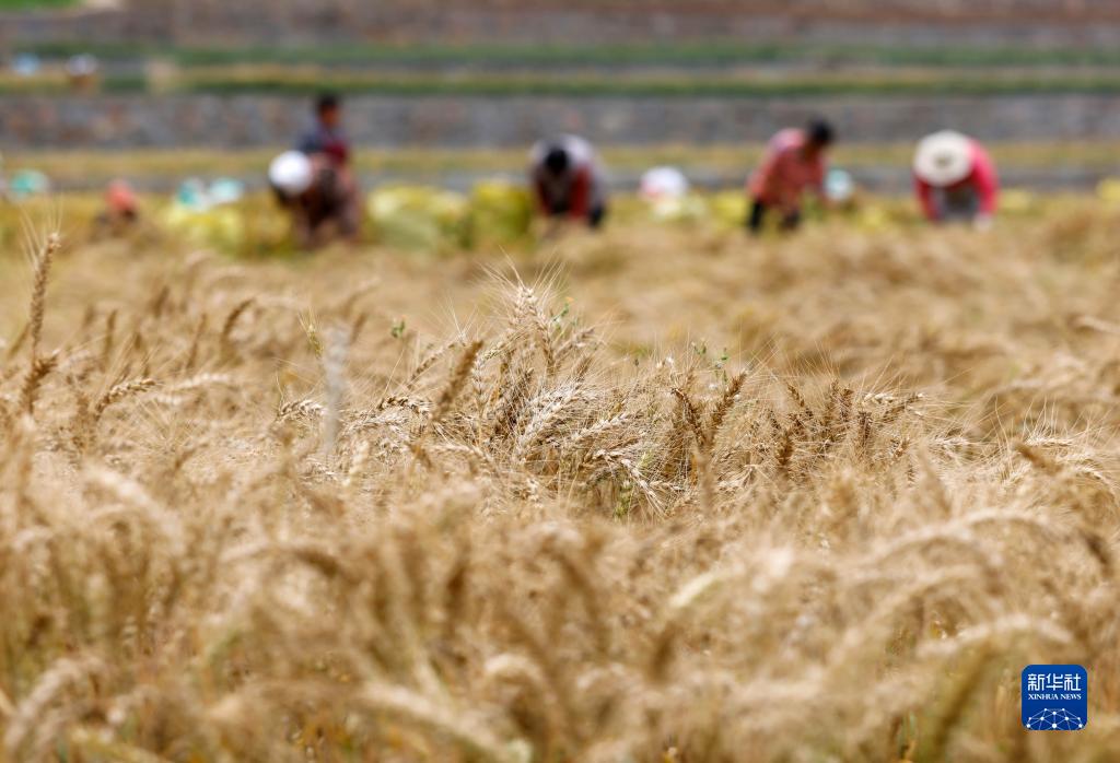 5月14日,農民在貴州省遵義市正安縣安場(chǎng)鎮勝利社區收割小麥。