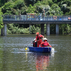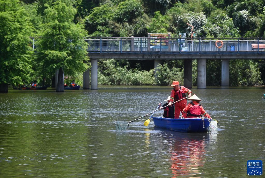 5月15日,工作人員在杭州市臨安區青山湖國家森林公園清潔水上漂浮物。