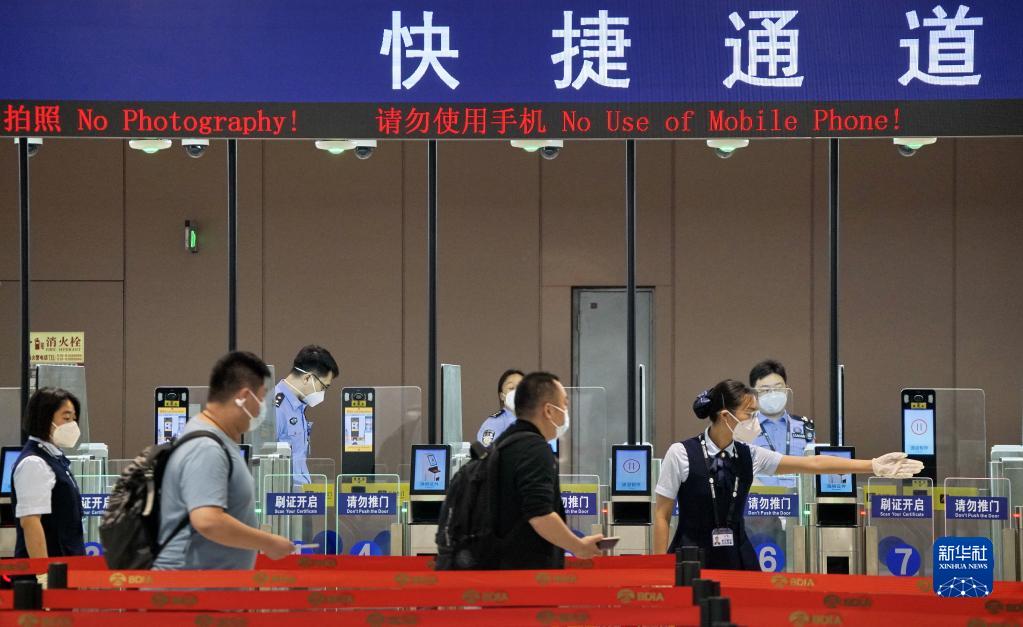 5月15日,旅客準備通過(guò)北京大興機場(chǎng)邊檢站快捷通道。
