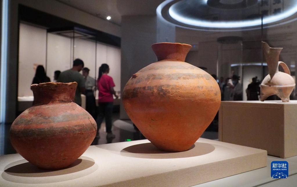 5月15日,在山東省青州博物館新館,大汶口文化彩陶壺正在進(jìn)行展出。
