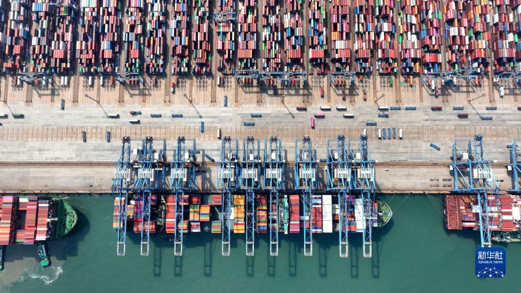 山東港口青島港全自動(dòng)化碼頭進(jìn)行裝卸作業(yè)(5月14日攝,無(wú)人機照片)。
