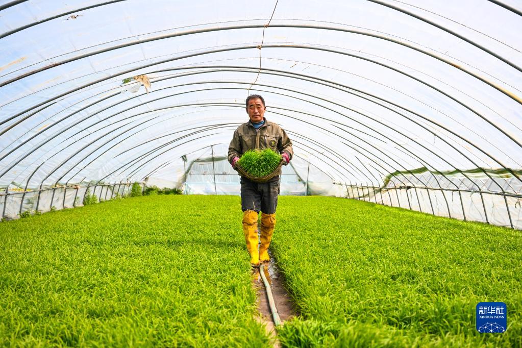 5月15日,農民在育秧棚中搬運秧苗。