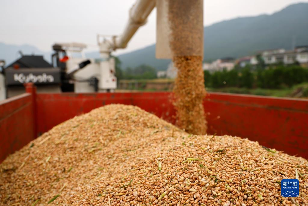 5月15日,在正安縣安場(chǎng)鎮興莊社區,農民將小麥裝車(chē)。
