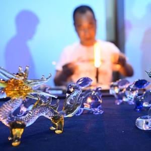 5月16日,民間藝人譚志國展示手工制作玻璃工藝品技藝。