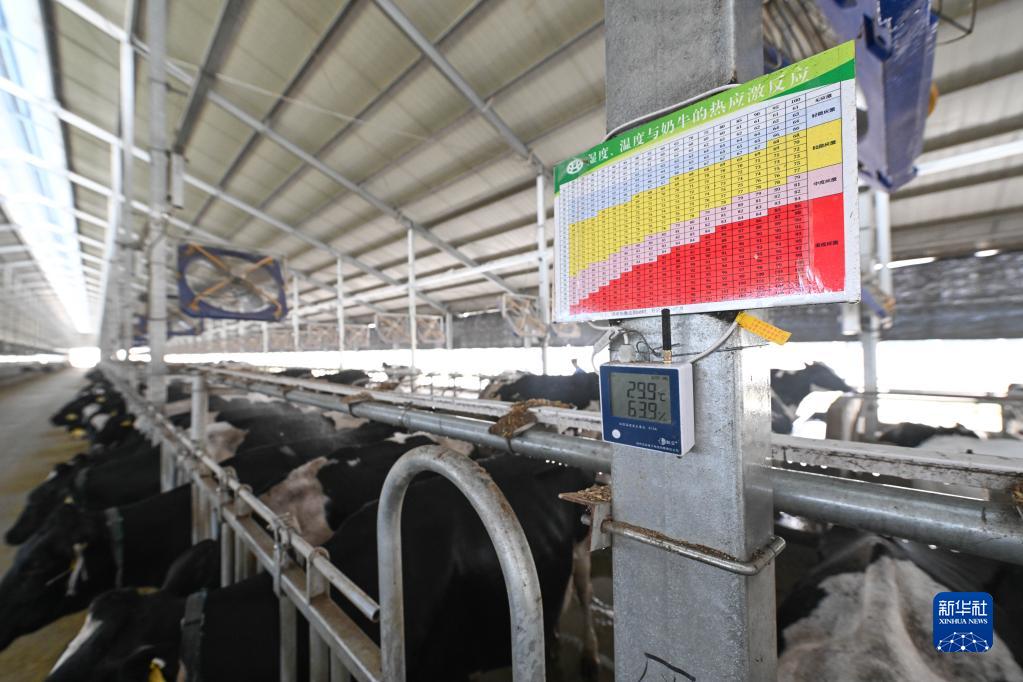 天津天食智慧牧場(chǎng)牛舍內的溫度、濕度傳感器,可自動(dòng)開(kāi)啟風(fēng)扇、噴淋設施為牛舍降溫(5月15日攝)。