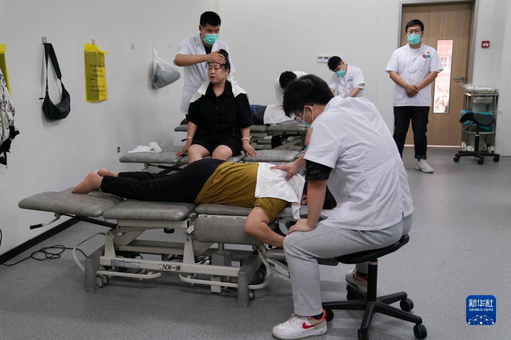 5月16日,在江蘇省鎮江市潤州區黎明社區衛生服務(wù)中心針灸推拿科,醫務(wù)人員為患者進(jìn)行推拿治療。