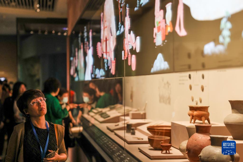 5月16日,觀(guān)眾在參觀(guān)“海岱日新——山東歷史文化展”展出的史前時(shí)期陶器。
