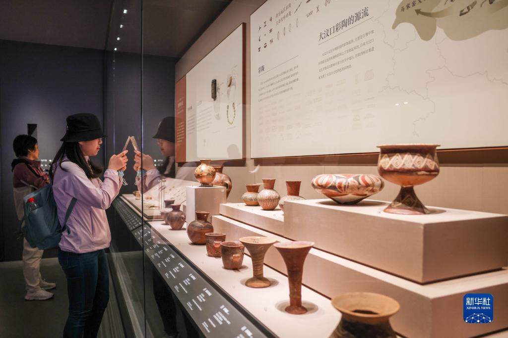 5月16日,觀(guān)眾在參觀(guān)“海岱日新——山東歷史文化展”展出的史前時(shí)期陶器。