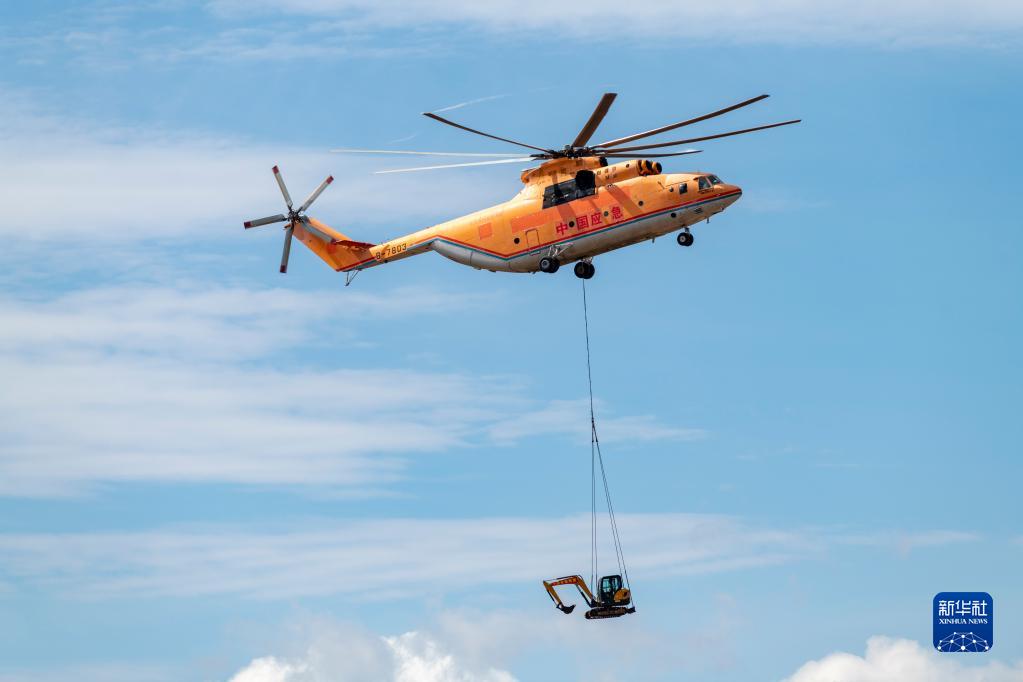 5月16日,一架參演直升機在麗江演習現場(chǎng)上空轉運一臺挖掘機。