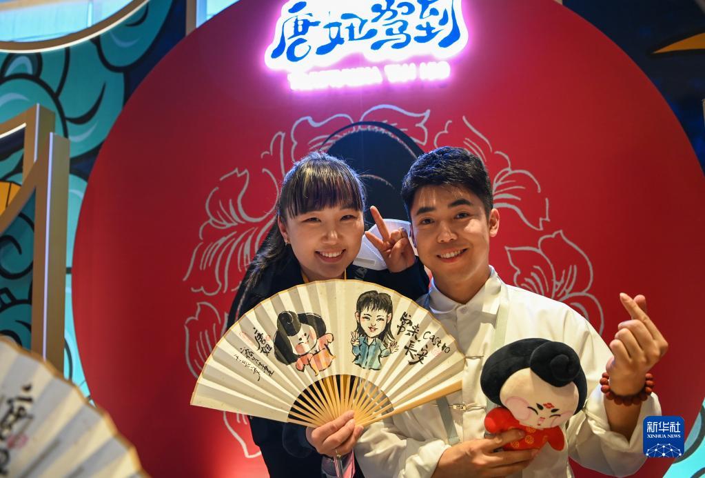 5月16日,在中國-中亞峰會(huì )新聞中心,一位來(lái)自蒙古國的記者(左)與水墨扇面畫(huà)制作師合影。