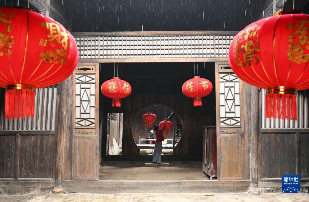 村民在湖南省常寧市中田村古民居內掛燈籠(3月3日攝)。