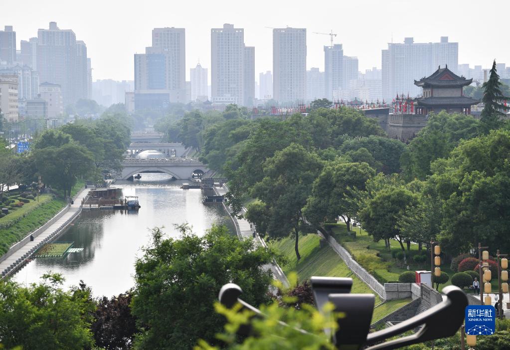 這是5月15日拍攝的西安市明城墻護城河。