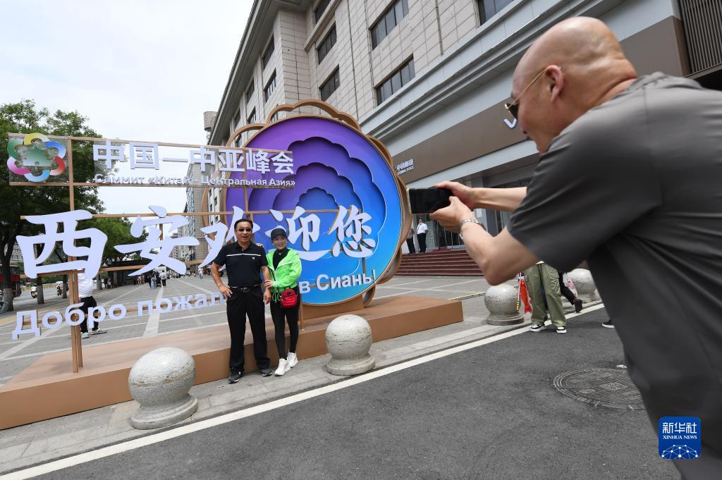 5月16日,游客在西安市北大街上與中國-中亞峰會(huì )主題裝置合影。