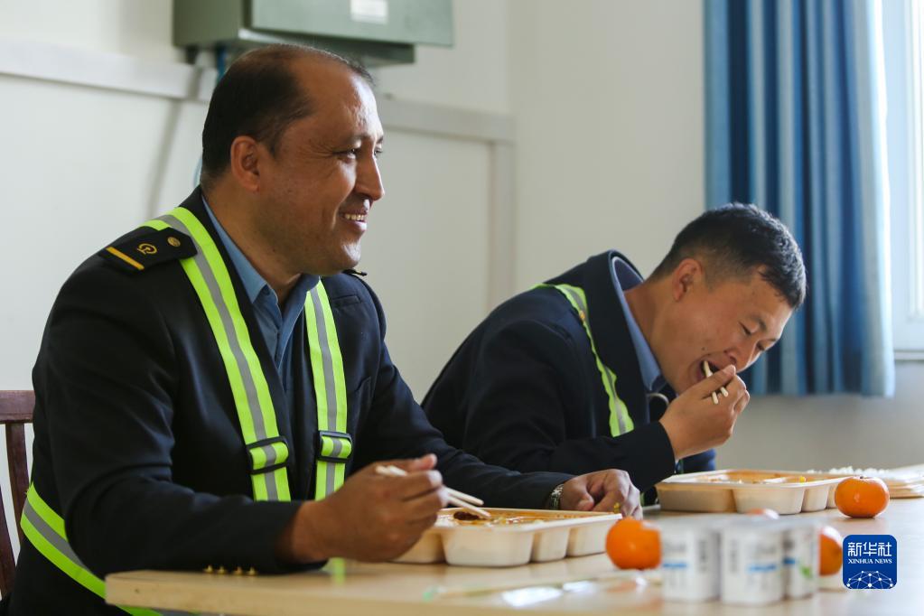 5月14日,在霍爾果斯鐵路口岸,海米提·吐?tīng)柡购屯乱黄鸪晕顼垺?/p>