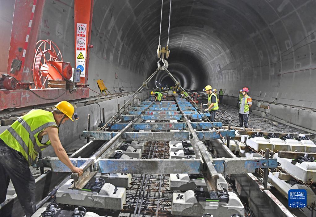 5月16日,工作人員在中鐵五局南玉鐵路6標段平悅隧道進(jìn)行無(wú)砟道床軌排安裝作業(yè)。