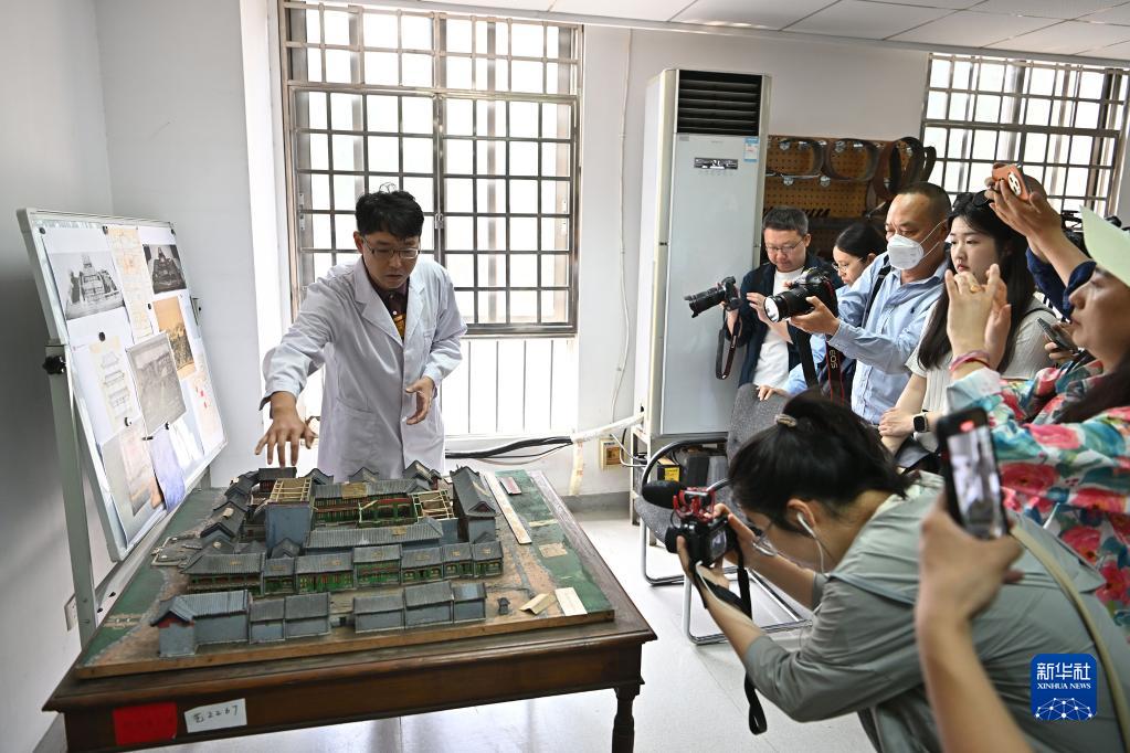 5月16日,國博文保院修復師王熙林(左)向媒體記者介紹圓明園同樂(lè )園建筑群樣式雷燙樣文物修復情況。