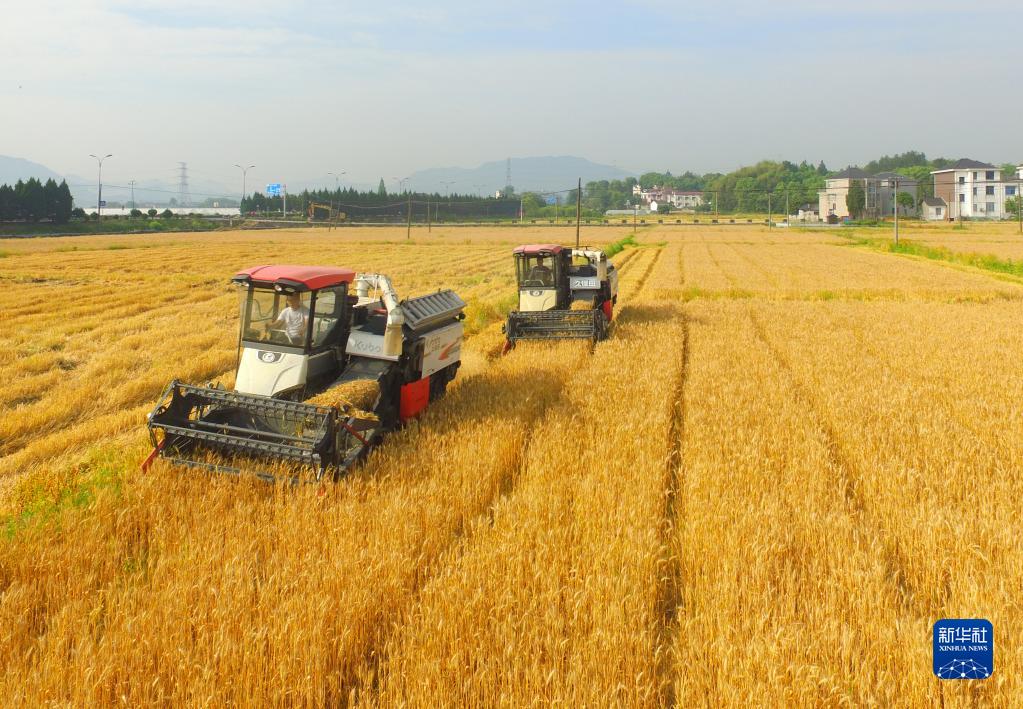5月16日,在浙江省建德市壽昌鎮山峰村田間,農民駕駛農機收割小麥(無(wú)人機照片)。