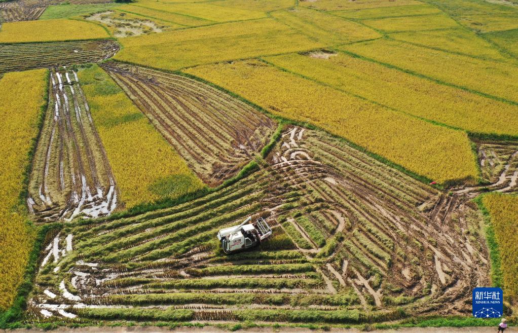 5月16日,收割機在稻田作業(yè)(無(wú)人機照片)。