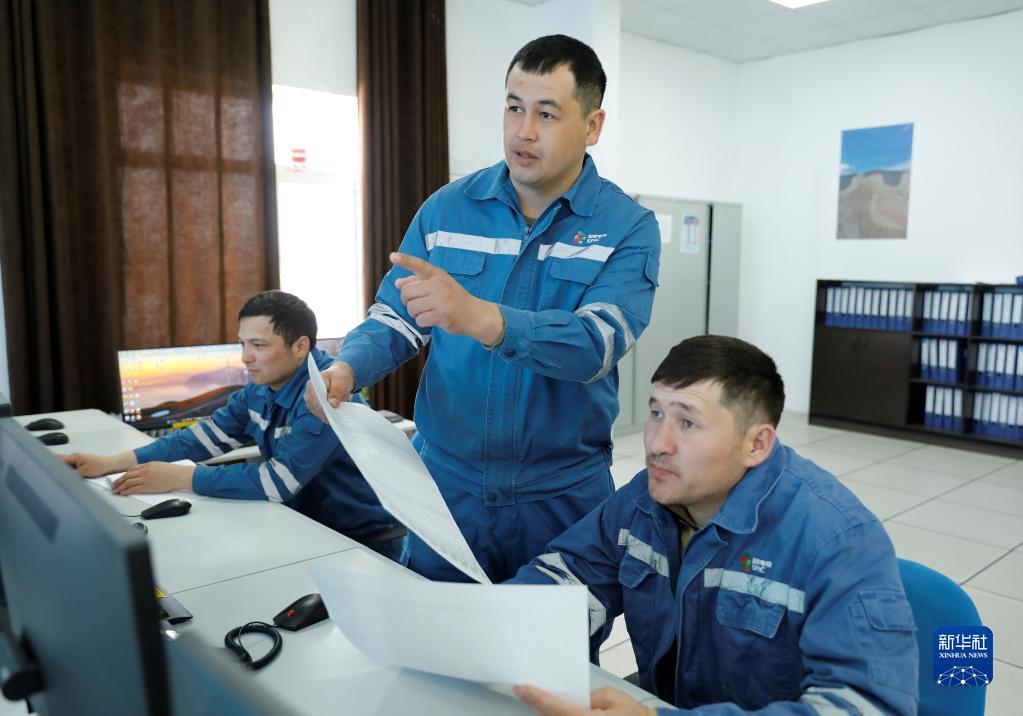 4月3日,在哈薩克斯坦札納塔斯,阿比爾加濟耶夫(中)在風(fēng)電項目中央控制室內工作。