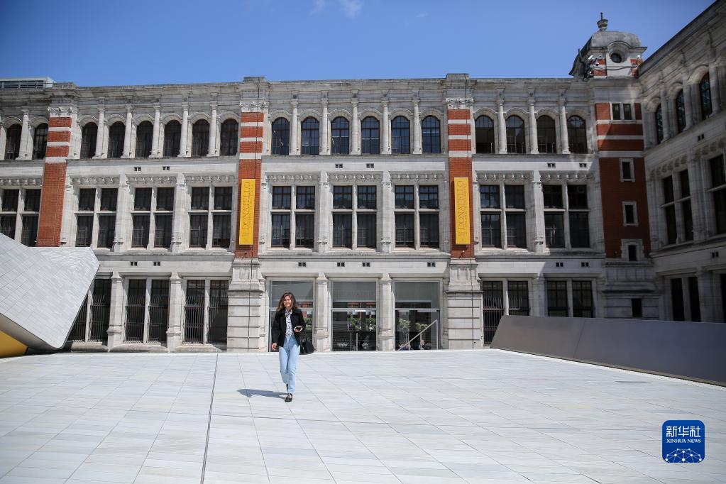 5月16日,一名女子走在英國倫敦維多利亞與艾爾伯特(V&A)博物館的庭院內。