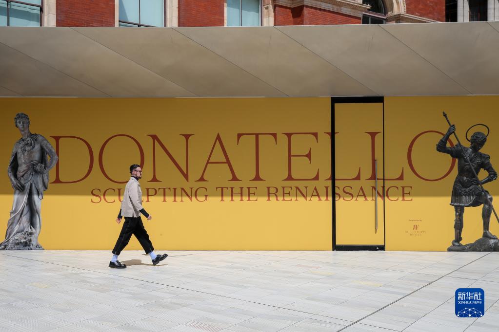 5月16日,在英國倫敦維多利亞與艾爾伯特(V&A)博物館,一名男子走過(guò)文藝復興時(shí)期雕塑家多納泰羅作品展海報。