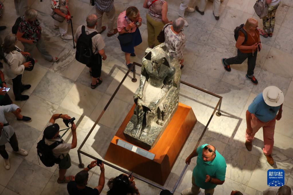 5月16日,人們在位于埃及首都開(kāi)羅的埃及博物館參觀(guān)古埃及法老哈夫拉的坐像。