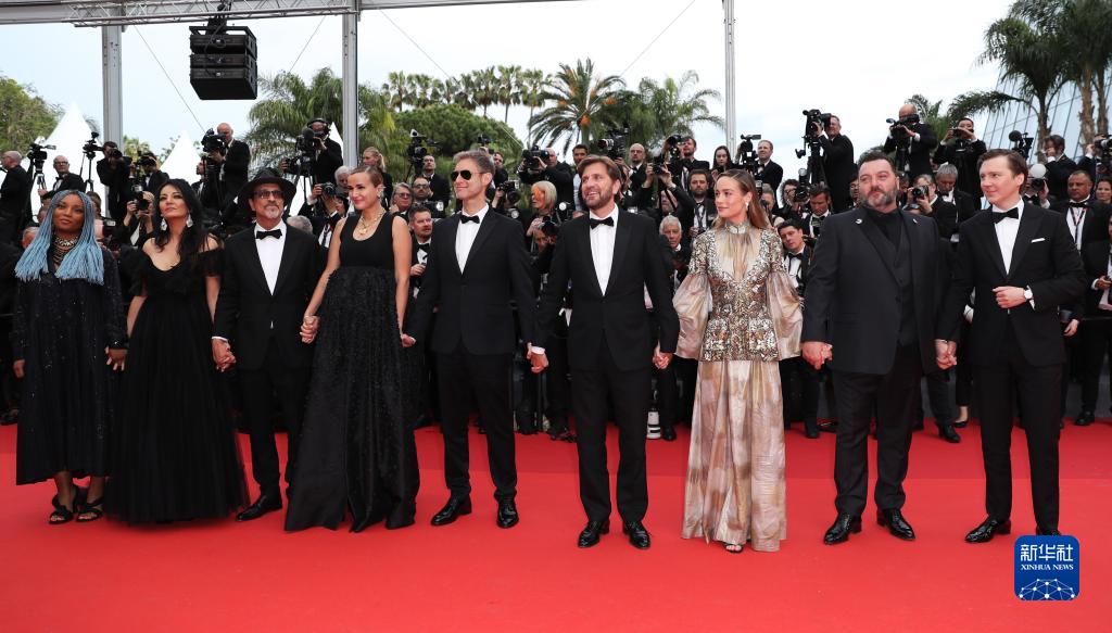5月16日,在法國戛納舉行的第76屆戛納國際電影節上,主競賽單元評審團主席、瑞典導演魯本·奧斯特倫德(右四)攜眾評委亮相開(kāi)幕式紅毯。