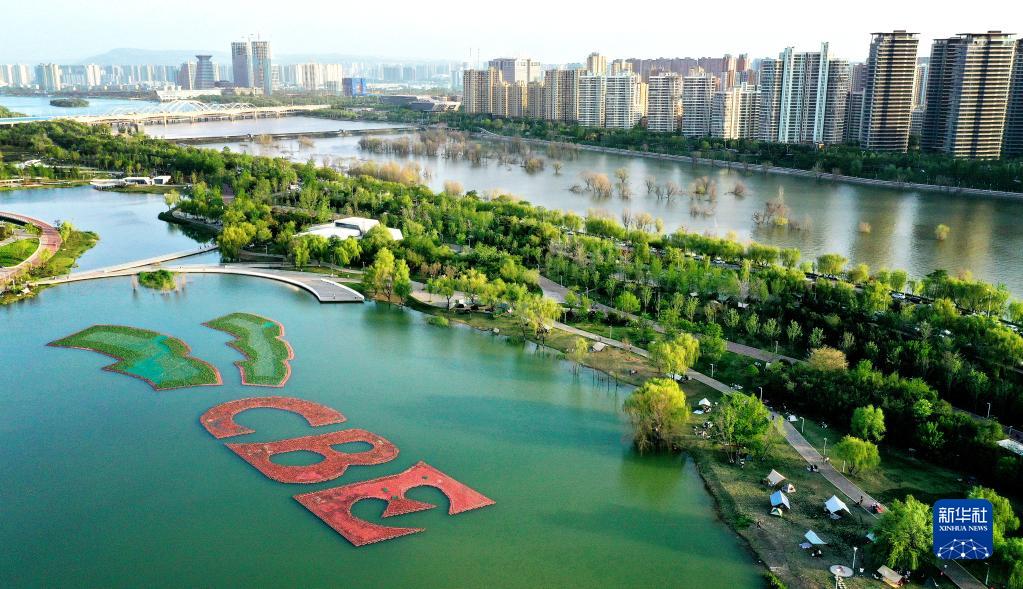 西安浐灞生態(tài)區灞河沿岸風(fēng)光(4月16日攝,無(wú)人機照片)。