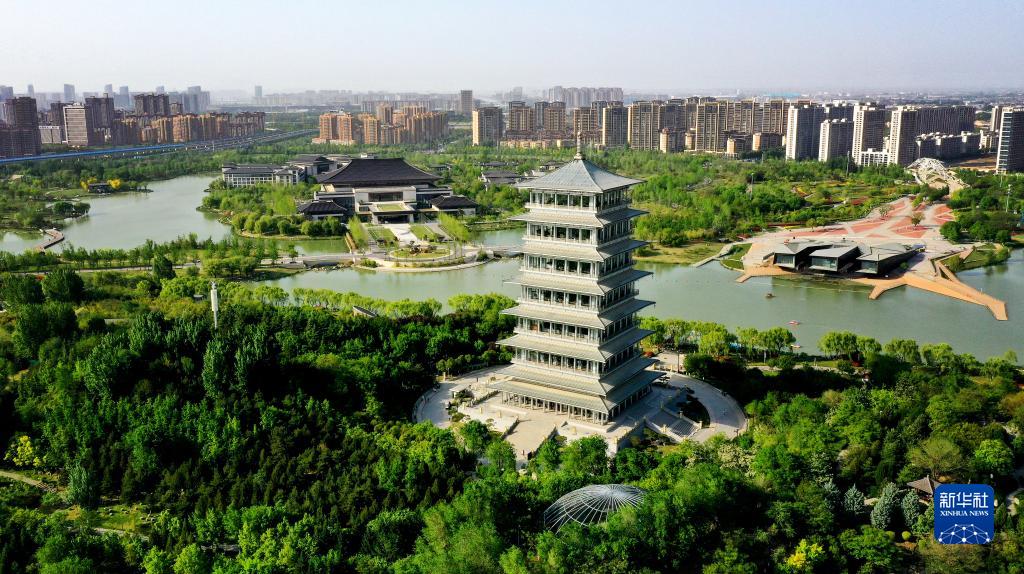 位于西安浐灞生態(tài)區的長(cháng)安塔(4月16日攝,無(wú)人機照片)。