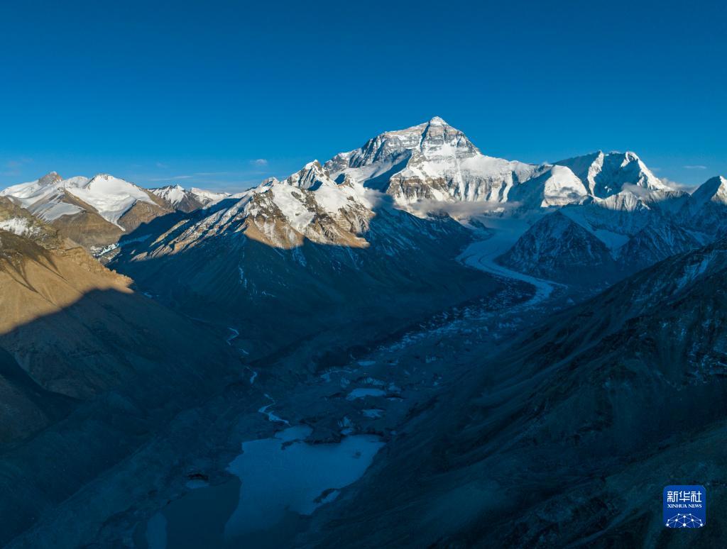 這是日落時(shí)分的珠峰和絨布冰川(5月16日攝,無(wú)人機照片)。