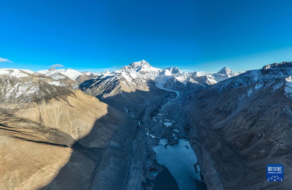這是日落時(shí)分的珠峰和絨布冰川(5月16日攝,無(wú)人機照片)。
