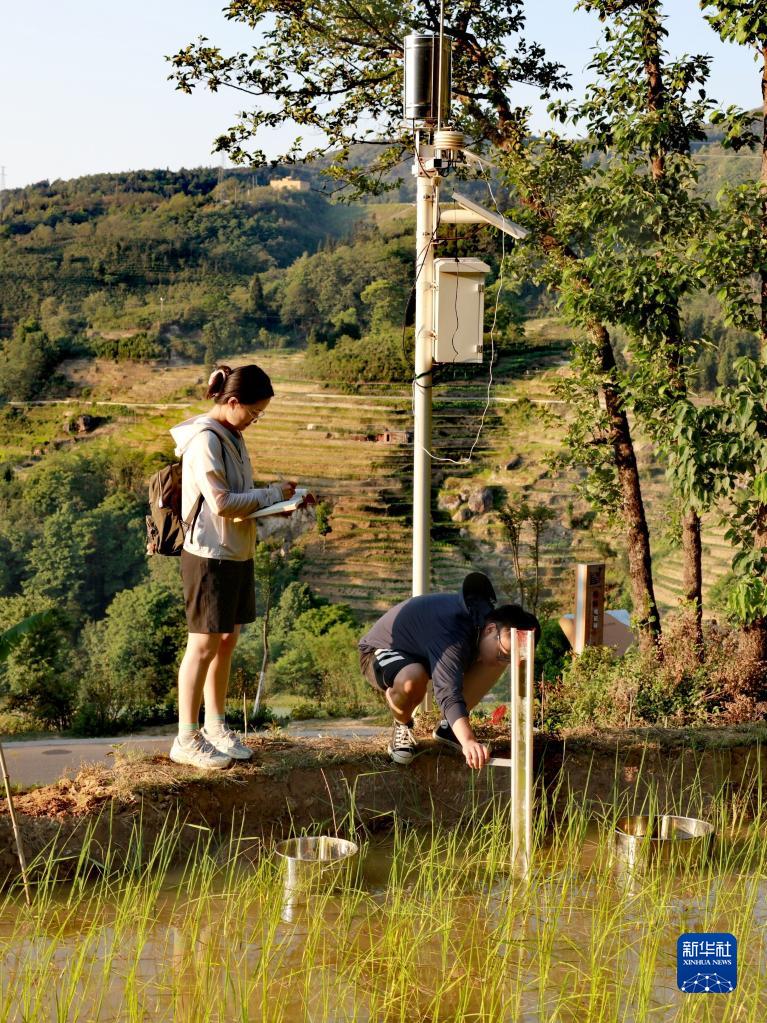 河海大學(xué)研究生張婉君(左)和孟祥虎在對稻田進(jìn)行水位測量和滲漏量觀(guān)測(5月7日攝)。