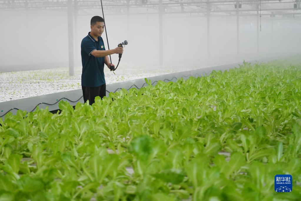 5月17日,饒陽(yáng)縣一處高品質(zhì)蔬菜產(chǎn)業(yè)園的工作人員在設施溫室對水培蔬菜進(jìn)行管護。