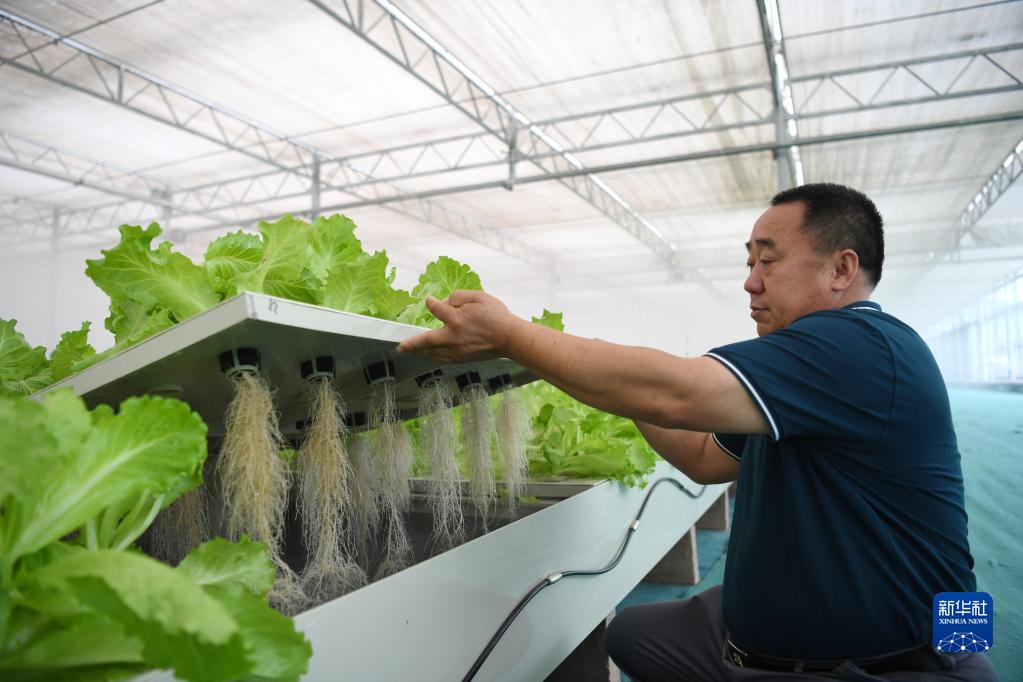 5月17日,饒陽(yáng)縣一處高品質(zhì)蔬菜產(chǎn)業(yè)園的工作人員在設施溫室查看水培蔬菜生長(cháng)情況。