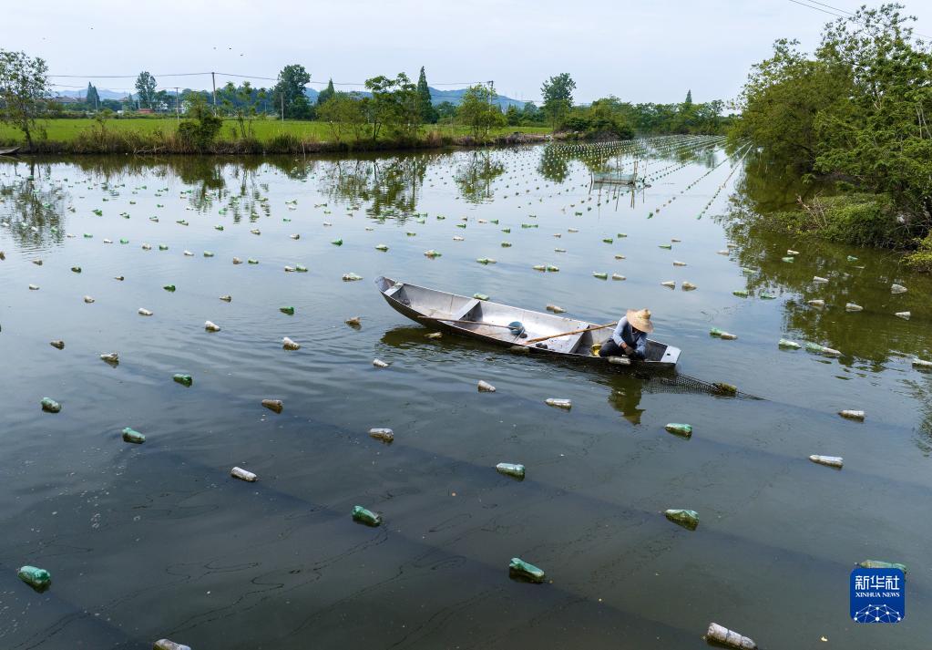 在浙江省諸暨市山下湖鎮一處珍珠生產(chǎn)基地,珠農查看珍珠生長(cháng)情況(5月16日攝,無(wú)人機照片)。