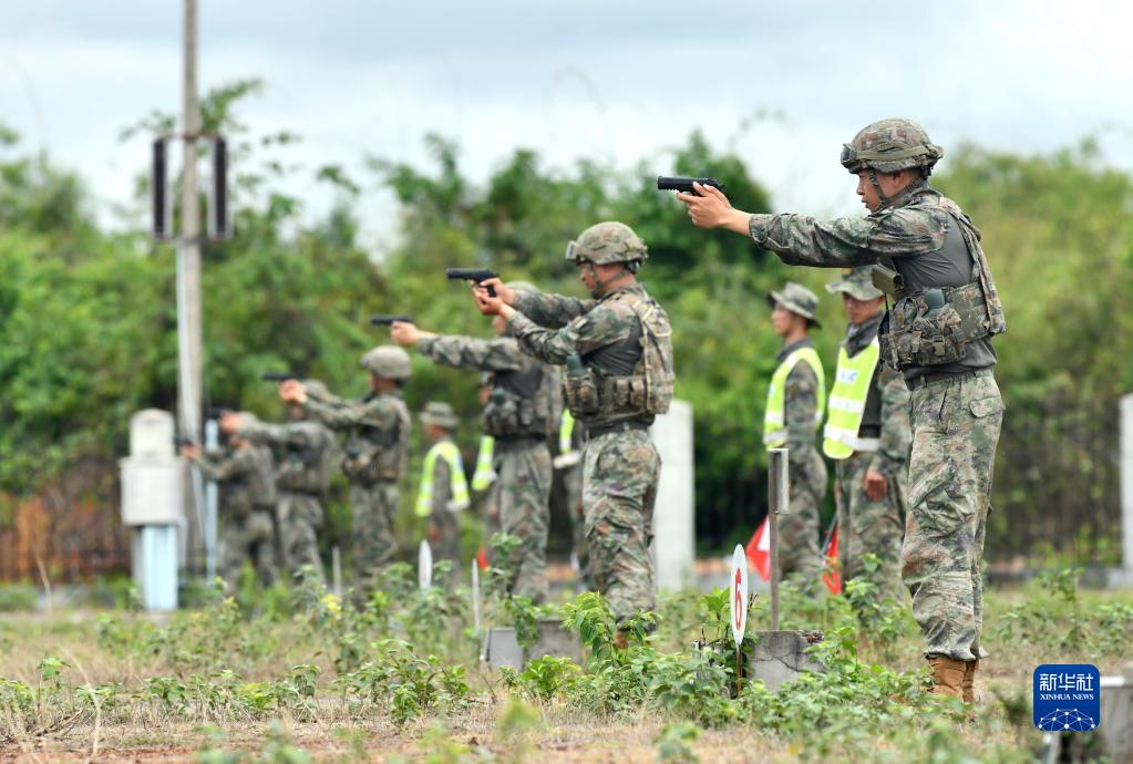 5月13日,在老撾人民軍庫瑪丹學(xué)院訓練場(chǎng),中方參演官兵進(jìn)行手槍射擊示范。