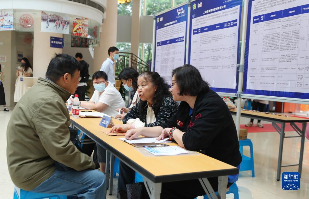 5月18日,招聘企業(yè)工作人員(右)在招聘會(huì )現場(chǎng)與求職者交流。