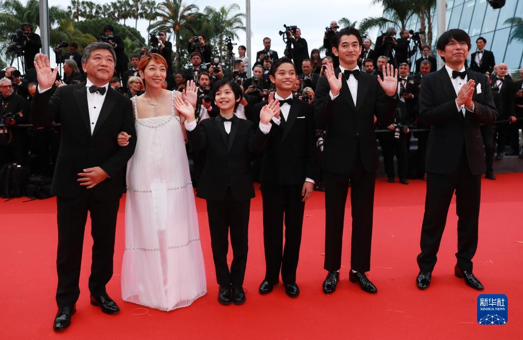 5月17日,在法國戛納舉行的第76屆戛納國際電影節上,日本導演是枝裕和(左一)攜主創(chuàng )人員亮相日本影片《怪物》首映禮紅毯。